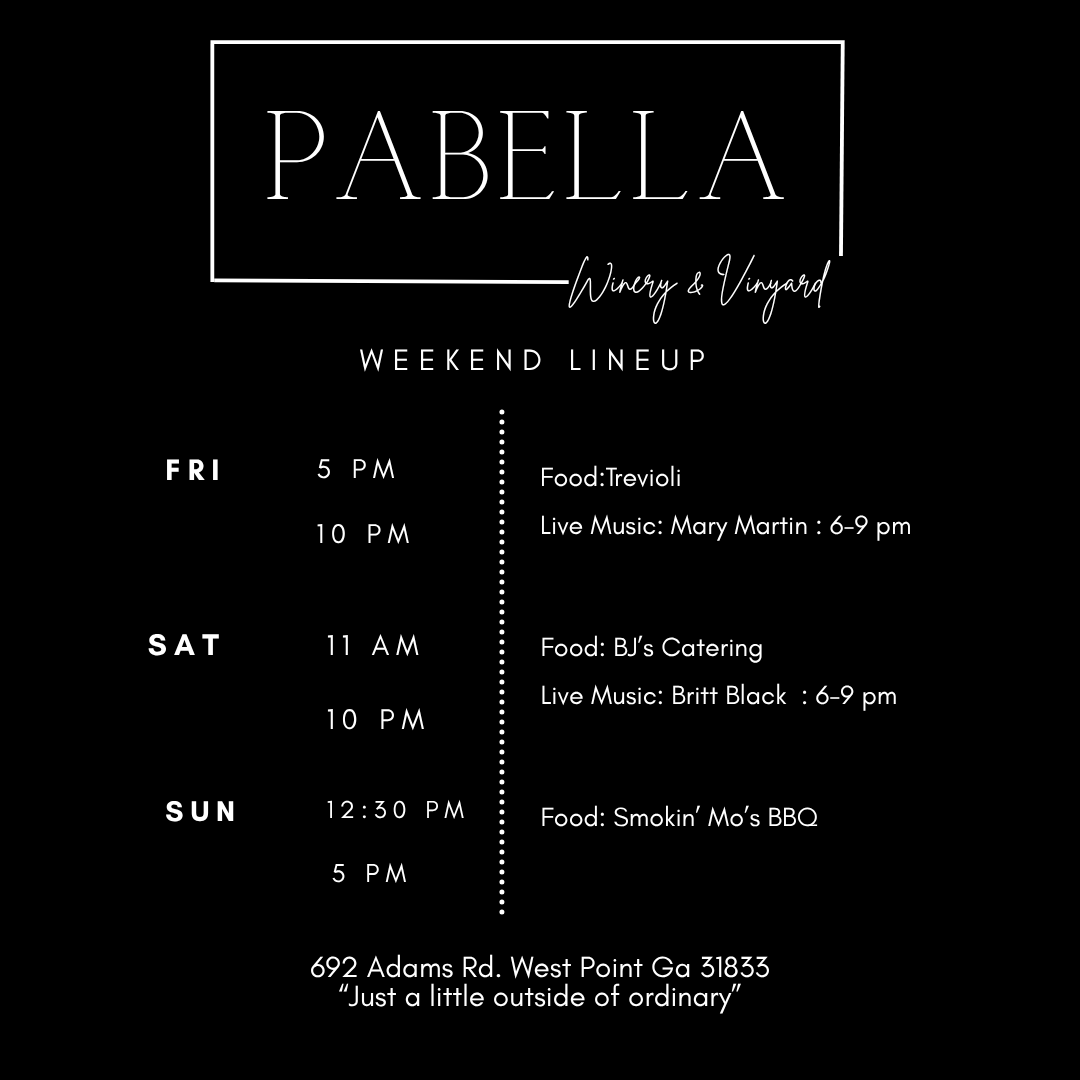 Weekend Lineup Friday, March 27, 2026 5:00 PM Sunday, March 29, 2026 5:00 PM PaBella Winery & Vineyard 692 Adams Road West Point, GA, 31833 United States (map) Google Calendar ICS
