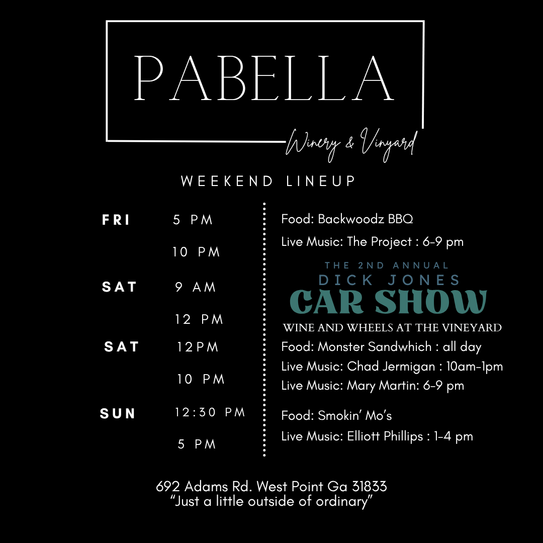 Weekend Lineup Friday, October 10, 2025 5:00 PM Sunday, October 12, 2025 5:00 PM PaBella Winery & Vineyard 692 Adams Road West Point, GA, 31833 United States (map) Google Calendar ICS