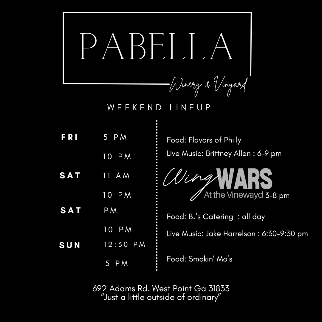 Weekend Lineup Friday, October 3, 2025 5:00 PM Sunday, October 5, 2025 5:00 PM PaBella Winery & Vineyard 692 Adams Road West Point, GA, 31833 United States (map) Google Calendar ICS